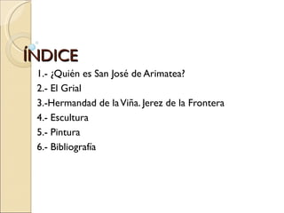 El documento proporciona información sobre San José de Arimatea. Brevemente, explica que según la tradición católica, José de Arimatea era el propietario del sepulcro donde fue enterrado Jesús y ayudó a bajarlo de la cruz. También se le atribuye el traslado del Santo Grial y otras reliquias. El documento luego describe representaciones escultóricas y pictóricas de José de Arimatea.
