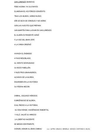 El documento es la letra de la marcha "San Lorenzo" que conmemora la batalla de San Lorenzo en 1813. En la batalla, las huestes de San Martín se prepararon en el convento de San Lorenzo para luchar contra las fuerzas enemigas. Los granaderos argentinos, liderados por el héroe Cabral, defendieron con valentía la libertad naciente de América del Sur a pesar de la pérdida de vidas como la de Cabral.