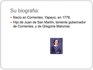 José de San Martín nació en Corrientes, Argentina en 1778. Se unió al ejército español a los 13 años y luchó en el norte de África. Regresó a América del Sur en 1812 para unirse a la lucha por la independencia. Organizó el Ejército de los Andes y cruzó los Andes para derrotar a los realistas en Chile en 1817. Más tarde invadió Perú, forzando su independencia en 1821. Renunció como Protector de Perú en 1822 y se retiró