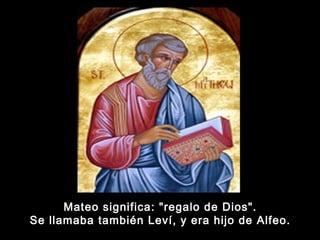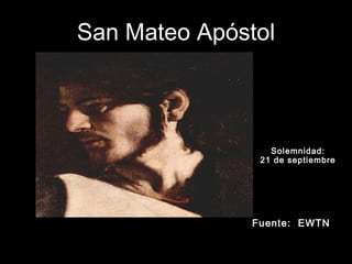 San Mateo fue un publicano o recaudador de impuestos que Jesús llamó a seguirlo. Dejó su trabajo para dedicarse a predicar el evangelio. Escribió uno de los cuatro evangelios del Nuevo Testamento, en el cual narra la vida, milagros y enseñanzas de Jesucristo, así como su pasión, muerte y resurrección. San Mateo evangelizó en Etiopía, donde murió martirizado por su fe.