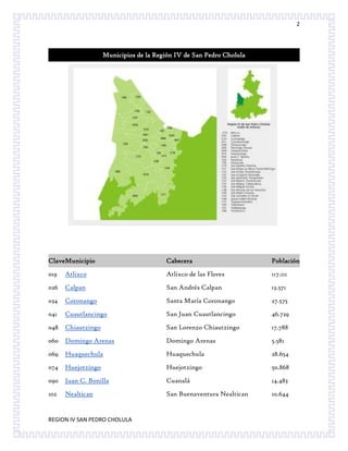 San Pedro Cholula tiene una población de aproximadamente 99,794 habitantes, la mayoría de los cuales son católicos. La economía se basa principalmente en la agricultura, incluido el cultivo de cebollas, jitomates y maíz, así como la apicultura y la ganadería. La región también atrae turistas gracias a atracciones históricas como la Gran Pirámide de Cholula y el Templo de Santa María Tonantzintla.