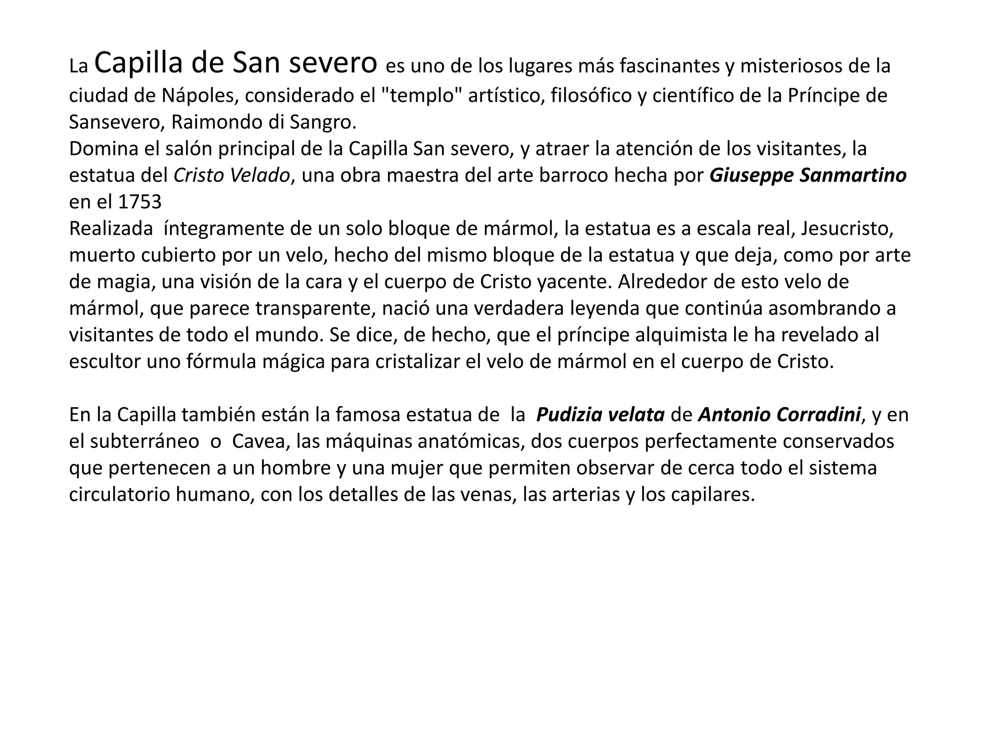 La Capilla de San severo en Nápoles contiene varias obras maestras del arte barroco, incluyendo la estatua de Cristo Velado hecha de mármol que parece tener un velo transparente, la estatua de la Pudizia velata, y en el subterráneo dos cuerpos anatómicos perfectamente conservados que muestran el sistema circulatorio humano.