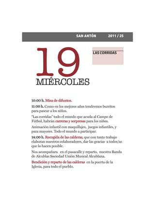 El documento anuncia las actividades del día de San Antón en 2011, incluyendo una misa a las 10 am, paseos en burro para los niños a las 11 am, carreras y juegos infantiles en el Campo de Fútbol, recogida y bendición de calderas a las 14 h, y reparto de calderas en la puerta de la iglesia para todo el pueblo, acompañados por la banda musical local.