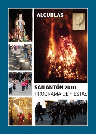 El documento presenta el programa de fiestas de San Antón del pueblo de Alcublas para el año 2010. Incluye el calendario de eventos, el himno de Alcublas, listados de teléfonos de comercios y asociaciones locales, y saludos del alcalde y concejala de cultura.