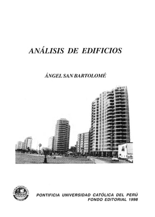 Este documento es un libro titulado "Análisis de Edificios" escrito por Ángel San Bartolomé en 1998. El libro presenta varios métodos para analizar estructuralmente edificios de concreto armado, acero y albañilería, incluyendo el método de Hardy-Cross y Cross indirecto. Explica conceptos como rigidez a flexión, coeficientes de distribución de momentos y momentos de empotramiento. También contiene ejemplos y programas de cómputo para apoyar el análisis estruct