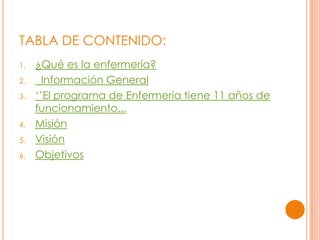 El documento detalla el programa de enfermería de la Universidad de Ciencias Aplicadas y Ambientales U.D.C.A, destacando su historia, misión, visión y objetivos. Se centra en la formación de profesionales capaces de abordar problemas de salud desde una perspectiva integral, enfatizando el cuidado, la investigación y la comunicación en el ejercicio de la enfermería. Además, menciona la importancia del desarrollo humano sostenible y la responsabilidad ética en la profesión.