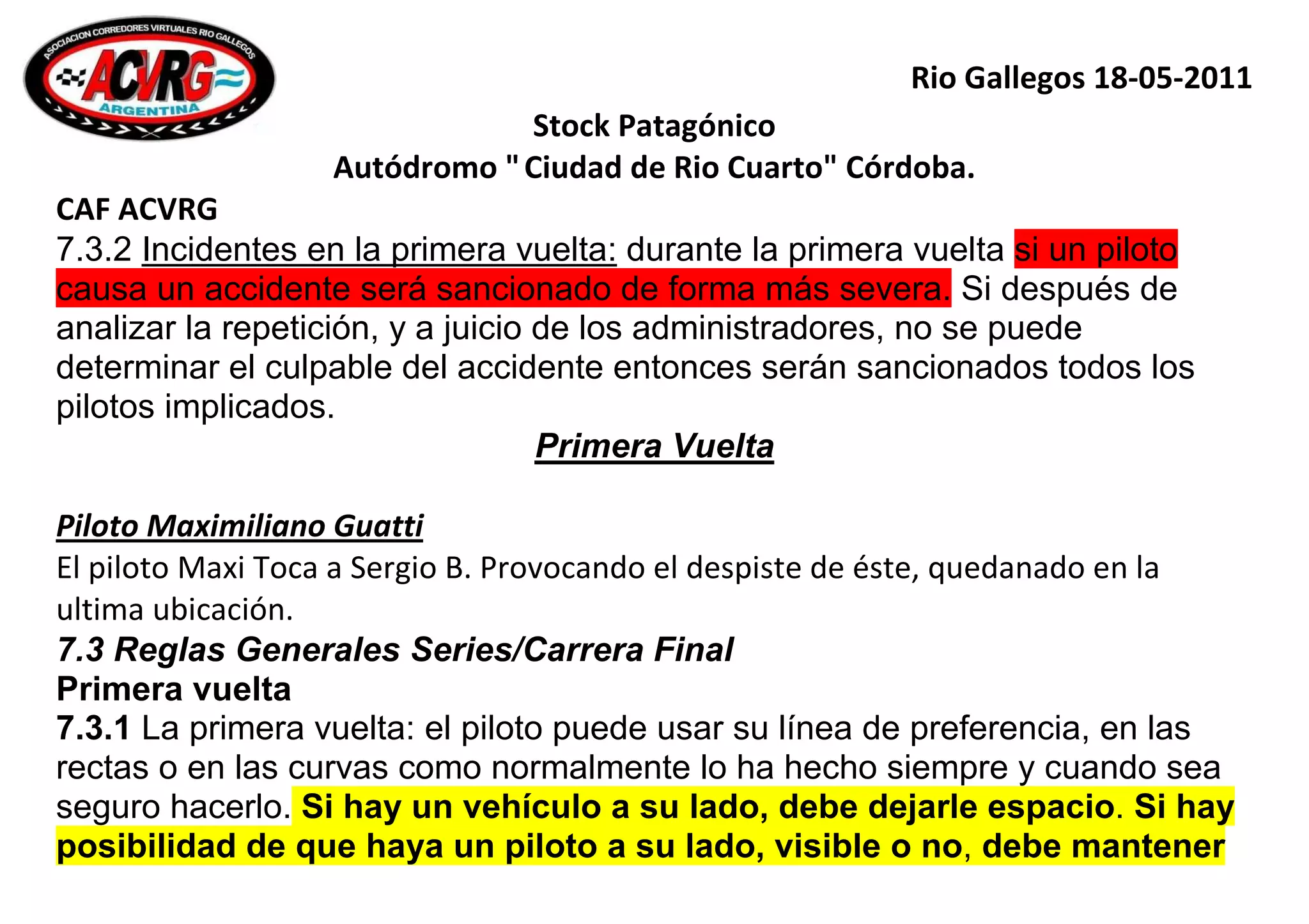 El documento describe incidentes en la primera vuelta de una carrera de autos. Se sancionó al piloto Maximiliano Guatti por tocar a otro piloto y provocar que se despistara en la primera vuelta. También se excluyó de la carrera a Juanma Wilche por no cumplir una sanción previa y a JP Peña por usar chat de manera indebida durante la carrera.