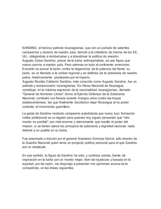 Este documento describe la gesta heroica de Augusto Sandino, un patriota y revolucionario nicaragüense que luchó contra las tropas estadounidenses que habían invadido Nicaragua. Sandino, con un pequeño ejército de campesinos y obreros, derrotó a la infantería de marina de EE. UU. durante 6 años, obligándolos a abandonar el país. El documento también proporciona antecedentes biográficos sobre Sandino, incluida su infancia de pobreza extrema y su participación en la lucha arm
