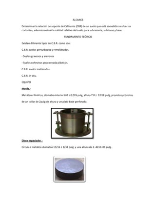 Este documento describe los procedimientos para determinar la relación de soporte de California (CBR) de un suelo sometido a esfuerzos cortantes y evaluar su calidad para subrasante, sub-base y base. Se especifica el equipo necesario como moldes, pisones, dispositivos de carga y medición. El procedimiento incluye preparar muestras con diferentes contenidos de humedad, compactarlas y medir su densidad y resistencia a la penetración para calcular la CBR en cada caso.