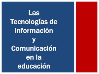 Este documento presenta información sobre las tecnologías de la información y la comunicación (TIC) y su integración en la educación. Explica que integrar las TIC no es solo adquirir artefactos tecnológicos, sino cambiar la forma de enseñar. También describe herramientas para crear materiales educativos como libros digitales, actividades interactivas y mapas conceptuales. Finalmente, ofrece recomendaciones sobre el uso de Internet en la escuela para sistematizar contenidos y promover la interacción.