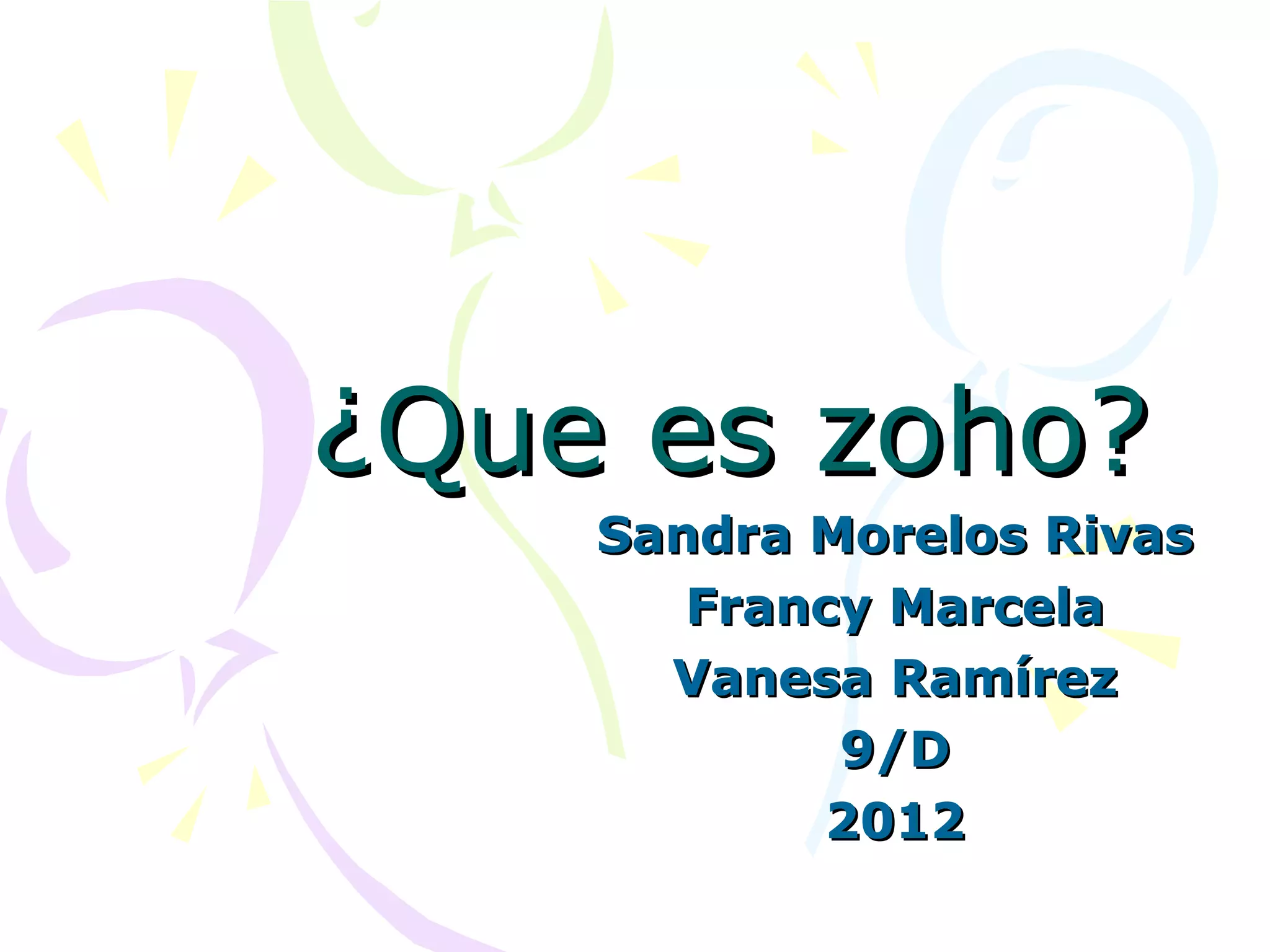 Zoho es un conjunto de aplicaciones web gratuitas desarrolladas por AdventNet que incluyen herramientas de oficina como procesador de texto, hoja de cálculo y presentaciones. Estas aplicaciones se ejecutan en cualquier navegador y ofrecen interfaces sencillas similares a Microsoft Office. Algunas de las herramientas de Zoho son Zoho Writer, un procesador de texto con funciones como deshacer/rehacer y almacenamiento ilimitado, y Zoho Sheet, una hoja de cálculo que permite fórmulas y gráfic