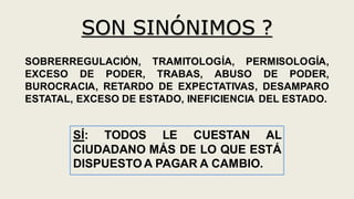 Este documento discute cómo la sobrerregulación estatal excesiva puede conducir a la corrupción. Argumenta que el estado peruano actual tiene una organización burocrática caótica y alejada de las necesidades de los ciudadanos, con más de 2,200 entidades estatales y 1.45 millones de empleados públicos. Esta sobrerregulación oculta impuestos a los ciudadanos y los expone a la corrupción de funcionarios. Para resolver esto, sugiere simplificar y reformar el estado, digitalizar trámites y que los organismos regul