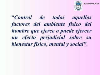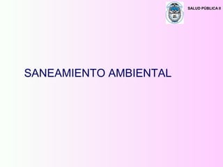Este documento trata sobre saneamiento ambiental y salud pública. Explica que el saneamiento ambiental incluye el control del agua potable, eliminación de excretas y basuras, y control de vectores. Describe las características del agua potable y las fuentes de abastecimiento, como aguas superficiales y subterráneas. También cubre la eliminación de aguas servidas y excretas a través de sistemas como pozos negros, cámaras sépticas y campos de nitrificación. Por último, insta a los grup