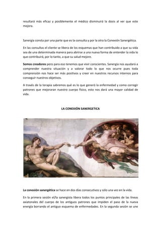 Este documento presenta la terapia Sanergía, la cual restablece la unión entre las líneas energéticas del cuerpo con la red energética del universo. La terapia ayuda a las personas a liberarse de esquemas limitantes y mejorar su salud a través de la activación de la mente y el autoconocimiento. Un componente clave es la Conexión Sanergética de dos sesiones, la cual limpia los patrones antiguos e integra los meridianos del cuerpo, trayendo equilibrio y alineación. Los beneficios incluy