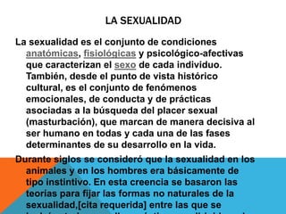 Este documento trata sobre varios temas relacionados con la sexualidad humana. Discute la definición de sexualidad según la OMS, las cuatro características propuestas de la sexualidad humana (erotismo, vinculación afectiva, reproductividad y sexo genético/físico), y los derechos sexuales fundamentales. También menciona factores que influyen en la orientación sexual y proporciona definiciones de conceptos clave como dispareunia y sus causas y tratamientos.