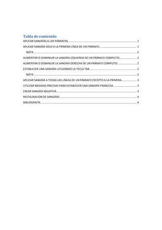Este documento proporciona instrucciones sobre cómo aplicar y modificar sangrías en Microsoft Word 2010. Explica cómo aplicar sangrías a párrafos individuales, aumentar o disminuir la sangría izquierda o derecha de un párrafo, crear una sangría francesa y restaurar las configuraciones de sangría predeterminadas. También cubre cómo establecer sangrías utilizando la tecla Tab y crear sangrías negativas.