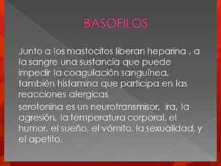La sangre está compuesta de elementos figurados como los glóbulos rojos y el plasma sanguíneo. Los glóbulos rojos, también llamados eritrocitos, son discos bicóncavos que transportan la hemoglobina para distribuir oxígeno a los tejidos. Los eritrocitos se producen en la médula ósea y maduran allí antes de pasar a la circulación sanguínea. La deficiencia de hierro, vitamina B12 o ácido fólico puede causar anemia al afectar la producción o maduración normal de los er