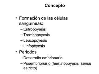 El documento trata sobre la hematopoyesis. Resume que la hematopoyesis es la formación de células sanguíneas a través de la diferenciación de células madre hematopoyéticas en la médula ósea. Explica que está regulada por factores de transcripción y citoquinas que estimulan la proliferación y supervivencia de las células progenitoras. Además, cubre los tipos celulares sanguíneos, órganos hematopoyéticos y esquema básico de diferenciación celular durante la hematopoy