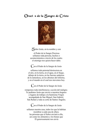 Este documento es una oración de protección que invoca el poder de la Sangre de Cristo para sellar y proteger a las personas y lugares mencionados de las fuerzas del mal. La oración pide protección para la casa, la familia, el trabajo, los viajes y la patria a través del poder de la Sangre de Cristo. Finalmente da gracias a Dios por la Sangre y Vida de Cristo que brindan salvación y protección.