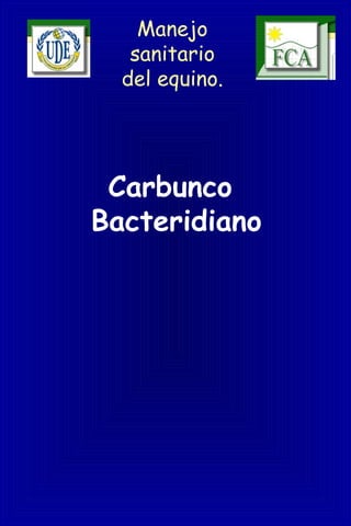 Este documento trata sobre varias enfermedades que afectan a los equinos. Brevemente describe el carbunco bacteridiano, una enfermedad septicémica causada por el Bacillus anthracis que puede causar la muerte súbita en los animales. También habla sobre la anemia infecciosa equina, una enfermedad viral crónica transmitida por insectos que causa fiebre, debilidad y anemia en los caballos. Por último, menciona la rinoneumonitis equina, un virus que puede provocar abortos en las yegu