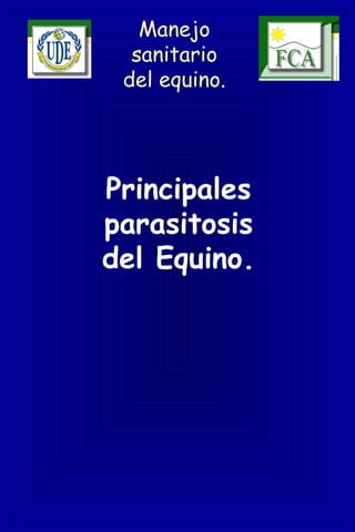 Este documento resume las principales parasitosis y endoparásitos del equino, incluyendo protozoos como Trypanosoma cruzi y Babesia spp.; nematodos como Strongylus spp., Parascaris equorum y Oxyuris equi; cestodos como Anoplocephala spp.; y el trematodo Fasciola hepatica. También describe la transmisión, síntomas y tratamiento de algunas de estas infecciones parasitarias comunes en equinos.