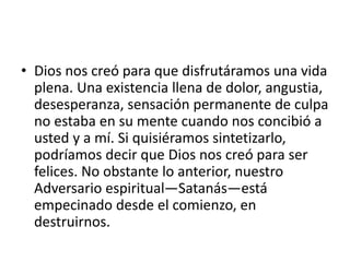 Dios nos creó para que disfrutemos una vida plena y feliz, pero Satanás busca destruir nuestra armonía interna y atarnos con prisiones. Jesucristo vino a liberarnos de estas cadenas y sanar nuestras heridas emocionales para darnos una vida renovada, pero debemos permitirle obrar en nosotros abriendo nuestras puertas. Aunque Dios nos ofrece lo mejor, Satanás tiene estrategias para dominarnos que incluyen el pecado y establecer ataduras en áreas de nuestra vida; sin