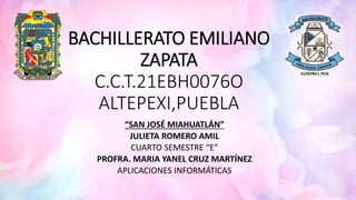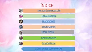 Este documento proporciona información sobre el municipio de San José Miahuatlán en Puebla, México. Describe su ubicación, tradiciones culturales como costumbres, traje típico y gastronomía local, así como datos demográficos y las principales actividades económicas. El sector primario relacionado con la agricultura y ganadería representa la mayor parte de la economía del municipio.