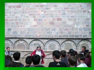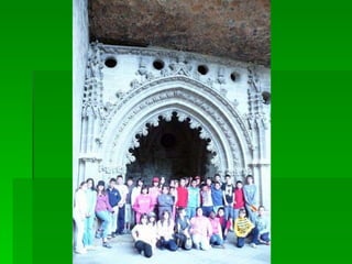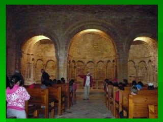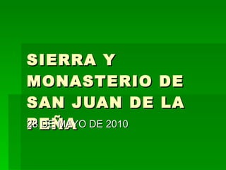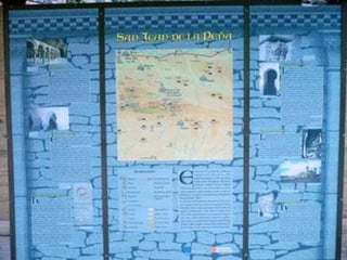 El documento describe una visita al Monasterio de San Juan de la Peña, mencionando que se almorzó en Santa Cruz de la Serós y se avistaron caballos, vacas, burros y buitres leonados en la montaña, además de escuchar pájaros e imaginar huellas de animales desde el mirador. También se menciona el Centro de Interpretación y los monasterios nuevo y viejo.