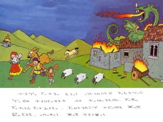 El documento narra la leyenda de San Jorge y el dragón. Un dragón estaba matando y comiendo a las personas y animales de un pueblo. Cuando ya no quedaban más animales, cada día elegían a una persona para ofrecerla al dragón. Un día, apareció el caballero San Jorge montado en un caballo blanco para luchar contra el dragón y matarlo. De la sangre del dragón nació un rosal con rosas rojas. San Jorge le dio una rosa a la princesa como símbolo de amor. Desde entonces