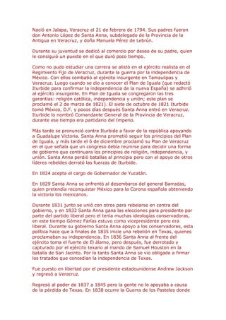 Antonio López de Santa Anna nació en 1794 en Veracruz, México. Se unió al ejército realista español durante la guerra de independencia de México pero luego se unió a las fuerzas insurgentes. Ocupó varios cargos políticos y militares a lo largo de su carrera, incluyendo gobernador de Yucatán y presidente de México en varias ocasiones turbulentas entre 1833 y 1855. Fue derrocado finalmente en 1854 debido a su gobierno autoritario y su pérdida de territorio mexic