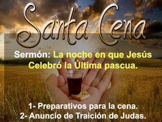El documento describe la Última Cena de Jesús con sus discípulos la noche antes de su crucifixión. Marcos coloca la cena entre dos anuncios, la traición de Judas y el abandono de los discípulos. Jesús y los discípulos prepararon la Pascua siguiendo las tradiciones judías, y fue durante esta cena que Jesús instituyó la Cena del Señor al dar nuevos significados al pan y el vino.