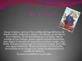 Santa Cristina nació en Italia en una familia noble no cristiana. Al convertirse secretamente al cristianismo, su padre la entregó a las autoridades para ser juzgada, quienes la sometieron a varios tormentos como cortarle los pechos y la lengua, pero milagrosamente no resultó herida. Finalmente fue asesinada con tres flechas y enterrada en un castillo. Su festividad es el 24 de julio.