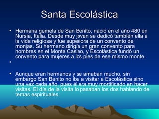 Santa Escolástica nació en Italia en el 480 como gemela de San Benito. Fundó un convento para mujeres mientras su hermano dirigía un convento para hombres. En su último encuentro antes de la muerte de Escolástica, le pidió a Benito que pasara la noche hablando de temas espirituales, pero él se negó debido a las reglas. Escolástica oró y se desató una tormenta que les impidió separarse. Tres días después, Benito vio el alma de su hermana subir al cielo en forma de