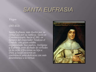 Santa Eufrasia nació en Constantinopla en el 380 d.C. en una familia noble y virtuosa. Desde pequeña mostró una gran devoción a Dios, por lo que a los 10 años decidió consagrarse al convento para siempre. A lo largo de su vida enfrentó acusaciones y envidias, las cuales superó con humildad y confianza en Dios. Murió a los 30 años llena de méritos, dejando un ejemplo de fortaleza y amor a Dios.