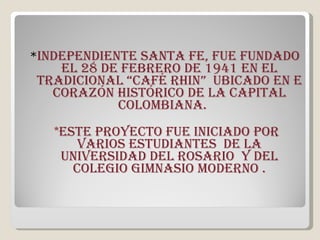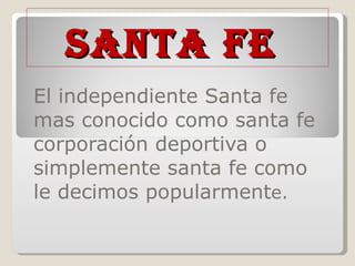 Independiente Santa Fe fue fundado en 1941 en Bogotá por estudiantes de la Universidad del Rosario y el Colegio Gimnasio Moderno. Fue el primer campeón del fútbol profesional colombiano en 1948. Desde entonces, ha ganado seis títulos de liga en 1958, 1960, 1966, 1971 y 1975, así como subcampeonatos en la Copa Colombia en 1950-1951.