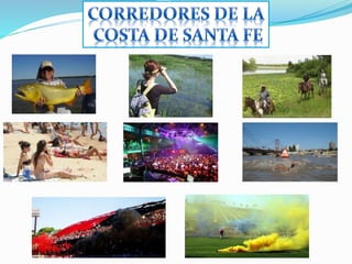 Este documento proporciona información general sobre la provincia de Santa Fe en Argentina. Santa Fe tiene una superficie de 133.007 km2 y una población de más de 3 millones de habitantes. La economía se basa principalmente en la agricultura, la ganadería y la industria. Algunas de las principales ciudades son la capital Santa Fe y Rosario.