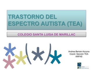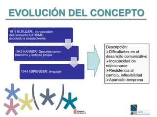 Este documento resume la evolución del concepto de trastorno del espectro autista (TEA), describiendo sus características principales como déficits en la interacción social, la comunicación y la imaginación. Explica que los TEA afectan el desarrollo y varían en gravedad, englobando casos leves y graves. También describe las dificultades comunes que presentan los niños con TEA y ofrece orientaciones para los profesores sobre cómo organizar el entorno educativo y la enseñanza para apoyar a estos estudiantes.