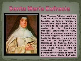 Rosa Virginia Pelletier, conocida como Hermana María Eufrasia, fundó la Congregación de Nuestra Señora de la Caridad del Buen Pastor en 1835. Bajo su liderazgo, la congregación creció rápidamente estableciendo 110 casas en todos los continentes para servir a mujeres y jóvenes en necesidad. Hermana María Eufrasia falleció en 1868 dejando un legado de compasión y servicio que continúa hoy a través de las Hermanas Activas y Contemplativas del Buen Pastor en 65 países.