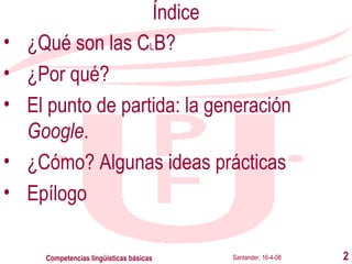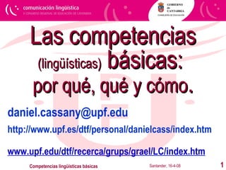 El documento describe las competencias lingüísticas básicas, incluyendo que son habilidades que los estudiantes deben desarrollar para incorporarse a la vida adulta y aprender de forma permanente. Explica que incluyen ocho competencias como la comunicación, matemáticas, ciencias, y tecnología. También discute por qué es importante enseñar estas competencias y algunas formas prácticas de hacerlo, como proyectos y tareas que integran diferentes habilidades.