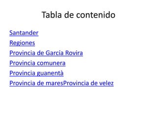 Santander está ubicada en la región andina de Colombia y consta de 6 provincias: García Rovira, Comunera, Guanentá, Mares, Vélez y Soto. Cada provincia tiene una ubicación distinta dentro del departamento y brinda información histórica y geográfica sobre su fundación y localización.