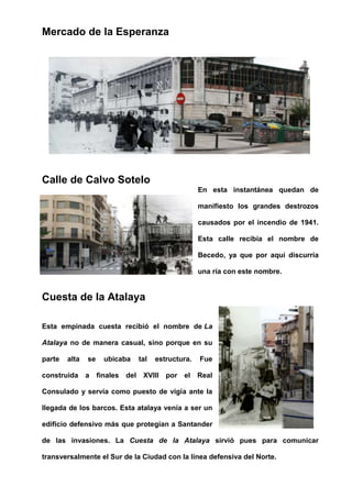Este documento presenta resúmenes breves de varios lugares en Santander, incluyendo plazas, calles y playas. Describe la historia y características de cada lugar, como nombres originales, edificios notables y eventos históricos. Los lugares discutidos incluyen la Plaza de Numancia, la Alameda Primera, la Calle de Calvo Sotelo, la Cuesta de la Atalaya, la Calle San José, la Plaza Porticada y el Paseo de Pereda.