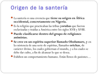 El documento resume los orígenes y creencias fundamentales de la santería. La santería proviene de las religiones tradicionales de los yorubas de Nigeria que fueron esclavizados y llevados a América. Creían en diversos orichas o espíritus que gobernaban el mundo y a los cuales se les rendía culto. Con la llegada de los colonizadores europeos, los orichas fueron identificados con santos católicos dando lugar a una religión sincretizada que combina elementos yorubas y cristianos.