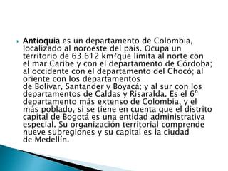 Antioquia es un departamento ubicado en el noroeste de Colombia con una población de más de 6 millones de habitantes. Su economía se basa principalmente en la industria y genera el 13% del PIB colombiano. Está dividido en 9 subregiones y 125 municipios, siendo Medellín su capital y ciudad más poblada.