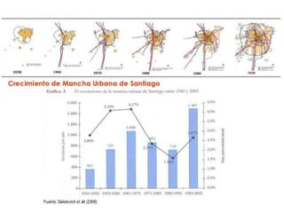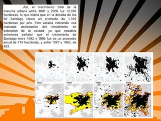 Santiago es la capital y ciudad más grande de Chile. Ha experimentado un rápido proceso de urbanización desde mediados del siglo XIX, con la población concentrándose cada vez más en la ciudad y sus alrededores. Aunque inicialmente era una ciudad compacta, Santiago se ha vuelto más difusa debido al crecimiento de las viviendas unifamiliares. Esto ha creado problemas como la congestión, la contaminación y la marginalidad urbana. El documento también describe la evolución de la ciudad y los desafíos del crecimiento urbano.