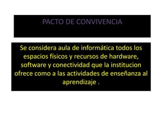 El documento establece normas básicas para el uso del aula de informática en una institución educativa. Prohíbe modificar archivos o instalar software sin autorización, acceder a páginas pornográficas o descargar juegos. Cada usuario debe tener su propia cuenta y el uso de los equipos es solo para fines académicos. Los estudiantes deben reportar cualquier daño a los equipos y asumir los costos de reparación si fue intencional. Al terminar cada clase deben dejar el aula ordenada.