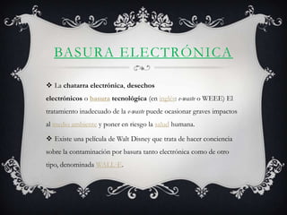 El documento habla sobre la basura electrónica y sus problemas ambientales y de salud. Explica que los desechos electrónicos contienen metales pesados como mercurio, plomo y cadmio que son dañinos para las personas y el medio ambiente. También menciona posibles soluciones como reducir la generación de desechos, donar o reciclar equipos electrónicos, y promover la responsabilidad extendida de los productores.
