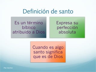 El documento explora la santidad cristiana y la Iglesia santa desde varias perspectivas. Discute la definición bíblica de santo y la naturaleza santa ontológica de la Iglesia según el Concilio Vaticano II. También examina la santidad moral de los miembros de la Iglesia, la dimensión escatológica y la tarea de resacralizar el mundo a pesar del pecado, concluyendo con los valores apologéticos y ecuménicos de esta doctrina.