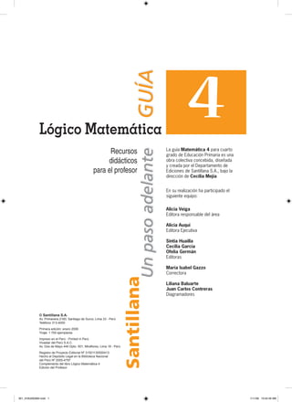Este documento presenta la Guía Matemática para el profesor del cuarto grado de Educación Primaria. Incluye organizadores de trabajo como el planificador anual, propuesta de programación y registro de evaluación. También contiene guiones didácticos para cada unidad con sugerencias para el desarrollo de los contenidos, y evaluaciones de entrada y salida. El objetivo es brindar al profesor recursos didácticos que lo ayuden en el aula.