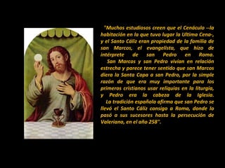 El documento resume la historia tradicional de la custodia del Santo Cáliz desde la Última Cena hasta su llegada a la Catedral de Valencia en el siglo XV. Según la tradición, san Lorenzo envió el cáliz a España durante las persecuciones de Valeriano en el siglo III, llegando primero a Huesca. Más tarde, ante la invasión musulmana del siglo VIII, el obispo de Huesca lo trasladó a diversos lugares hasta llegar a Jaca y San Juan de la Peña. En 1399 el rey Mart