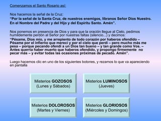 El documento describe el rezo del Santo Rosario, incluyendo cómo comenzar, los diferentes misterios (gozosos, luminosos, dolorosos y gloriosos), y las oraciones asociadas con cada misterio. También menciona las promesas de la Virgen María a quienes recen el Rosario y los beneficios de rezar esta oración.